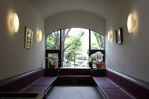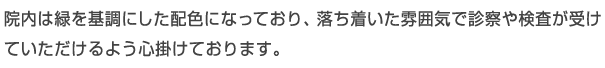 緑を基調にした室内から、窓の外にも緑がご覧いただけます。ゆったりとした空間でリラックスしてお待ちいただけます。。
